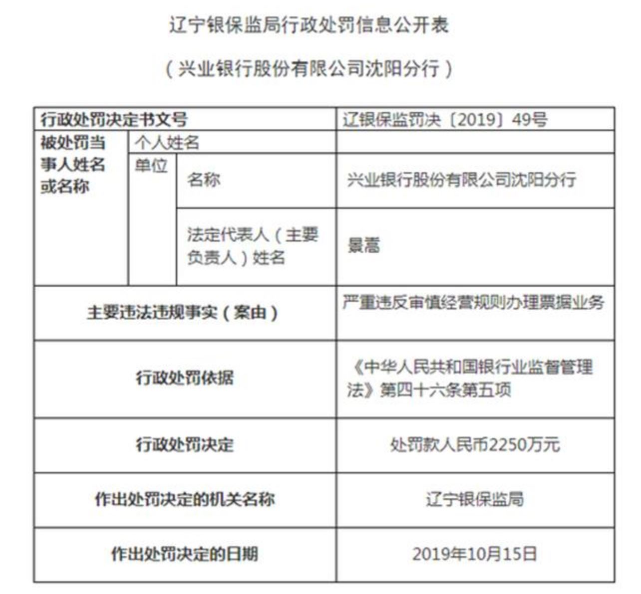 10月18日,辽宁银保监局一口气公布了5张对兴业银行沈阳分行及4名责任人的罚单。兴业银行沈阳分行因严重违反审慎经营规则办理票据业务,被罚款2250万元。与此同时,因上述票据严重违规事项,还有四命相关责任人受到禁业和警告处罚。