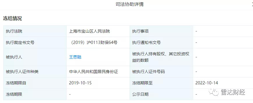 根据天眼查资料显示,近日,王思聪担任董事长并全资控股的普思资本新增一则司法协助信息。王思聪作为被执行人,所持普思资本股权遭上海市宝山区人民法院冻结,具体冻结数额不详,冻结日期自2019年10月15日起至2022年10月14日。