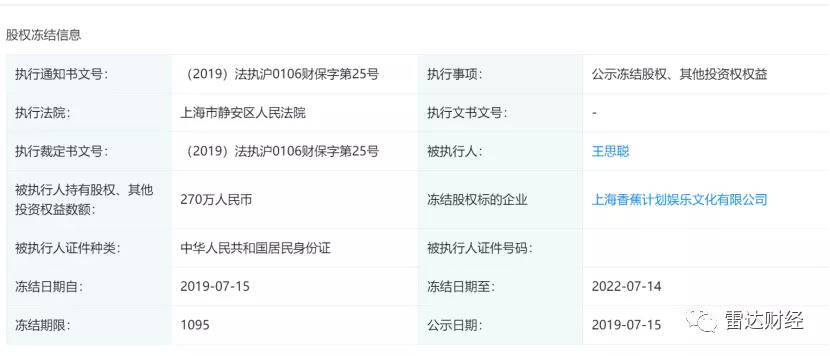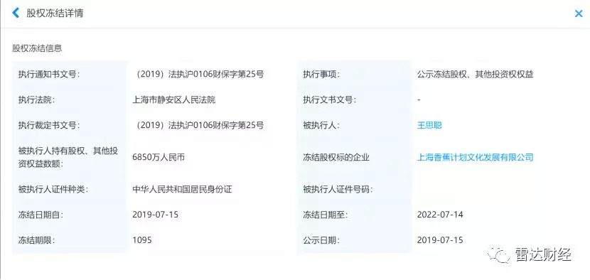 第三方信息平台企查查处信息显示,上海香蕉计划文化发展有限公司(下称“香蕉文化”)、上海香蕉计划娱乐文化有限公司(下称“香蕉娱乐”)于7月15日新增股权冻结警示信息,被执行人均为王思聪,冻结股权数额分别为6850万人民币、270万人民币。