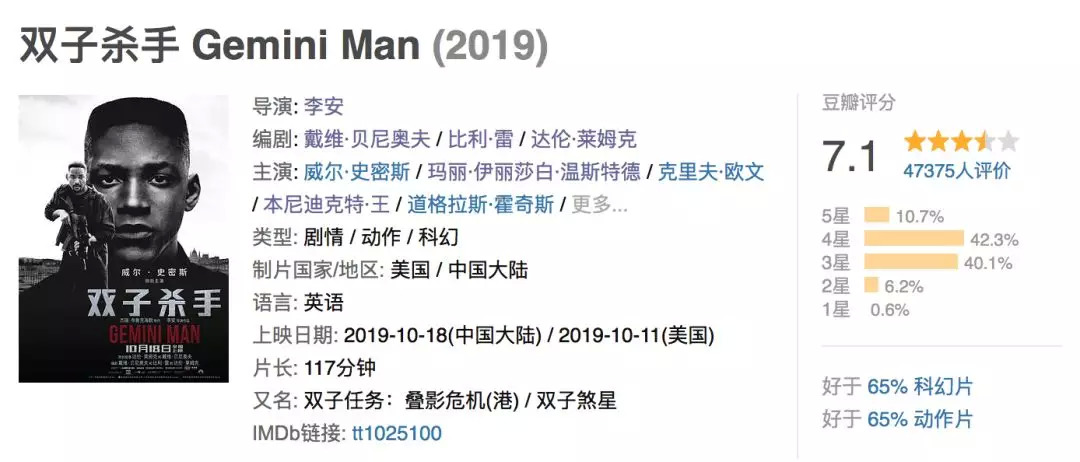 作为商业片,《双子杀手》的票房表现比《比利·林恩的中场战事》要好不少。但是,《比利·林恩的中场战事》好歹有8.4分的高口碑,《双子杀手》目前在豆瓣上仅有7.1分,是李安导演作品中难得的低口碑电影。