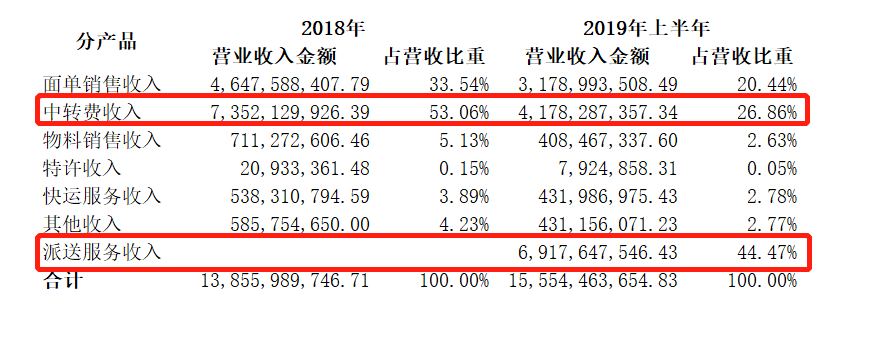 经调整后,据韵达2019年上半年半年报显示,其分产品营业收入相比2018年年报披露,多出了“派送服务费用收入”,且收入贡献高达44.47%。