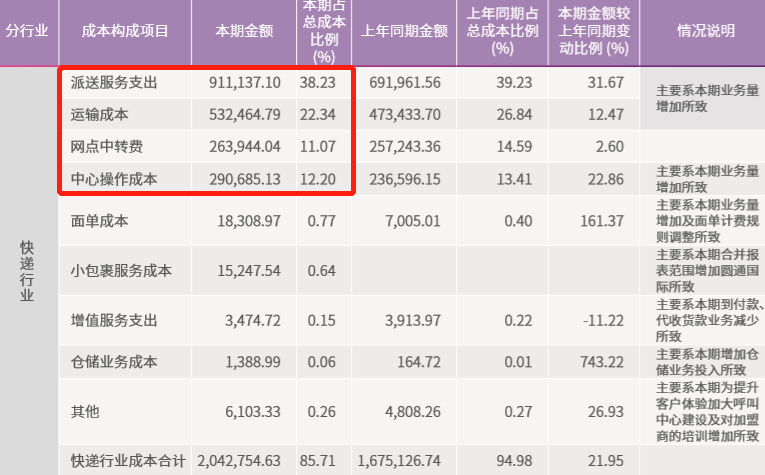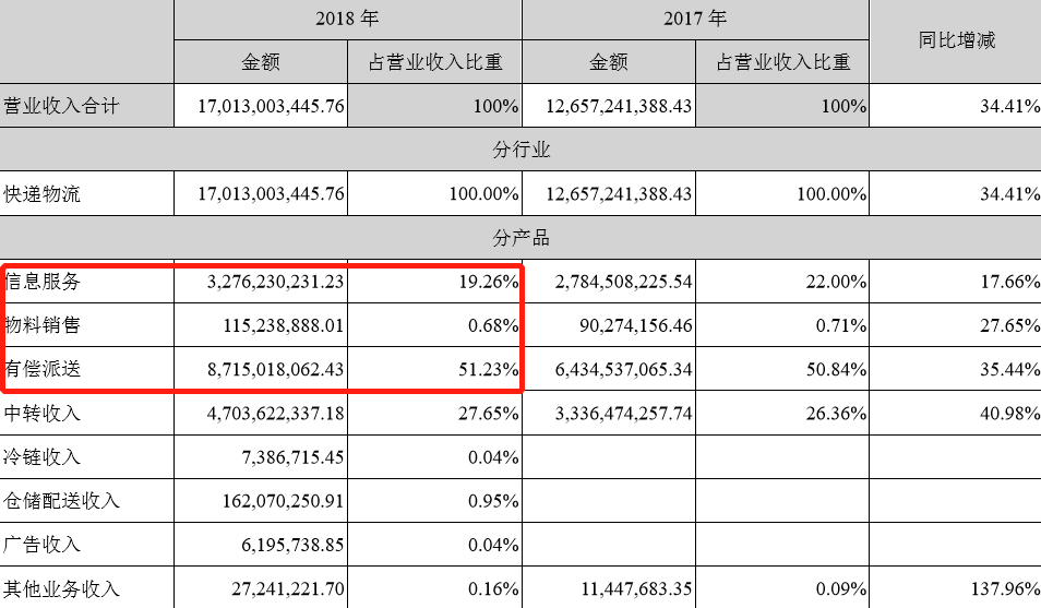 圆通方面,由于其2018年审计报告中未披露按产品分类的营业收入构成,但根据收入成本配比原则,从其2018年披露的成本项目构成中亦可看到,企业提供的诸如“派送服务支出”此类服务而产生的收入。