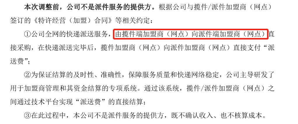 2018年12月29日,韵达在《关于对公司快递服务派件模式进行调整的公告》中表示:韵达从2019年1月1日起在公司全网范围内对快递服务中有关派件服务业务模式进行调整,本次调整后,将向加盟商提供的快递服务内容增加派件服务,与之对应,公司快递服务收入增加派费收入项目。