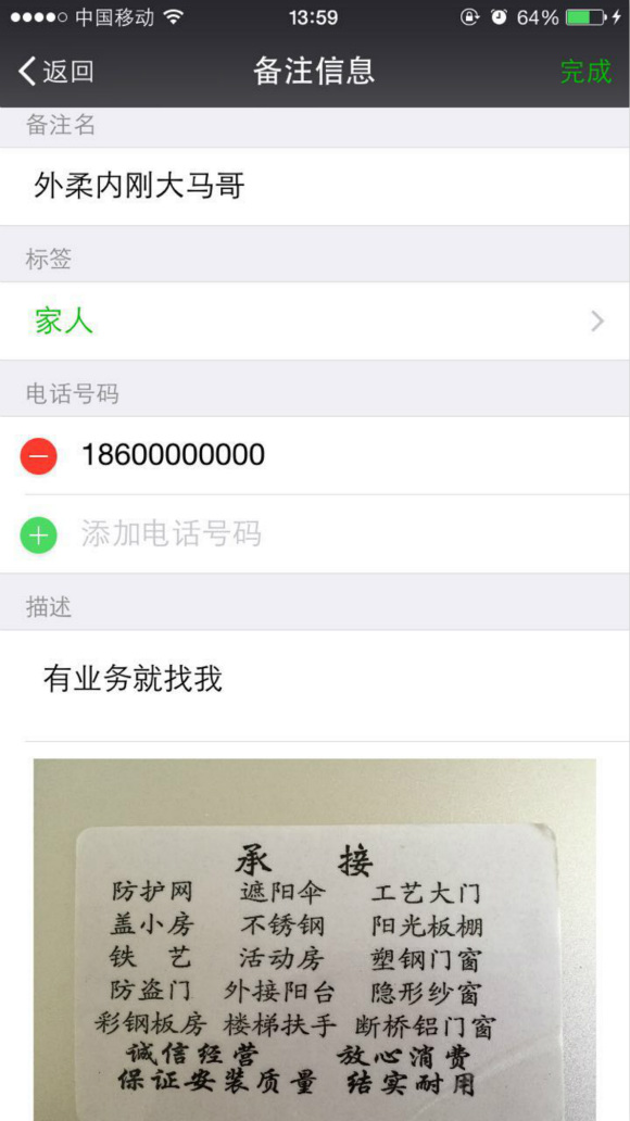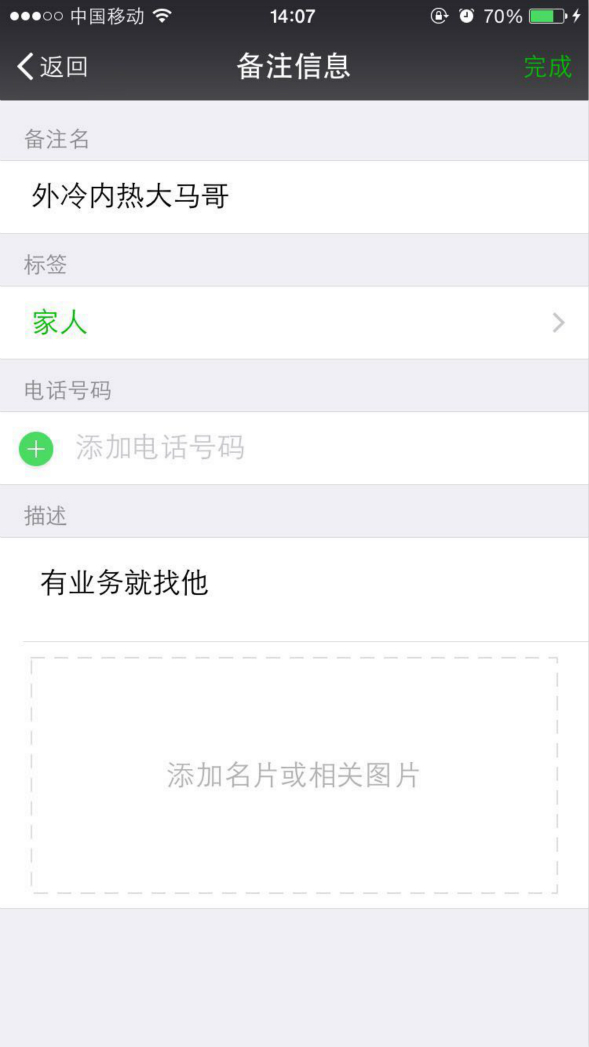很容易理解,就是从手机相片库里选取或拍摄一张照片放在微信好友备注框内,可以是他或她的照片(这样不至于联络人家时记不清对方长什么样子),可以是对方的名片,当然还可以是你们之间的一些美好回忆啦。