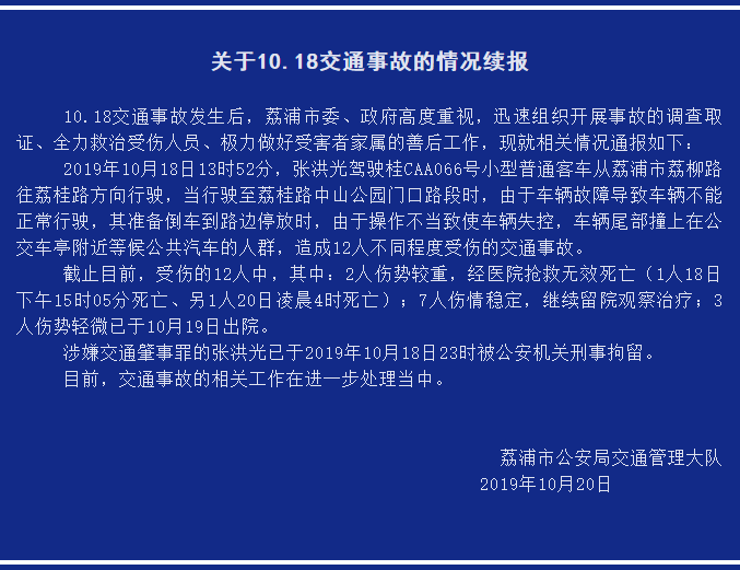 截至目前,受伤的12人中,其中:2人伤势较重,经医院抢救无效死亡(1人18日下午15时05分死亡、另1人20日凌晨4时死亡);7人伤情稳定,继续留院观察治疗;3人伤势轻微已于10月19日出院。