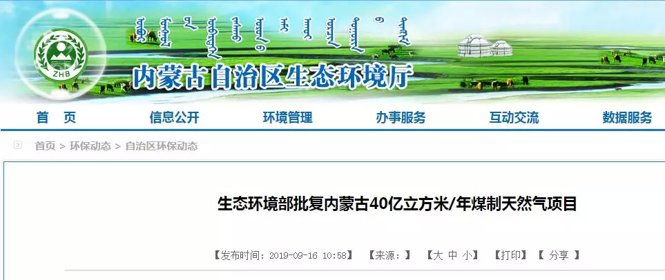 2019年9月16日,内蒙古自治区生态环境厅发布公告,内蒙古华星新能源有限公司(下简称“华星能源”)煤制天然气项目,正式取得生态环境部环评批复。