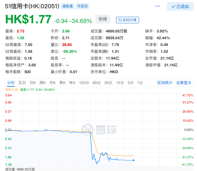 10月21日下午,51信用卡(HK:02051)停牌。午后,51信用卡股价跌破2港元至1.77港元,跌幅超30%,最大跌幅曾扩大至39%。截至发稿时间,51信用卡总市值约为21亿港元。