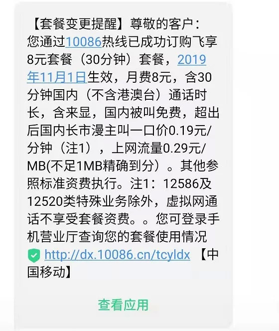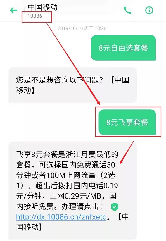 由于移动是支持短信开通业务的,所以只用查询到移动最低月租套餐的名字,再直接给 10086 发过去就好了。