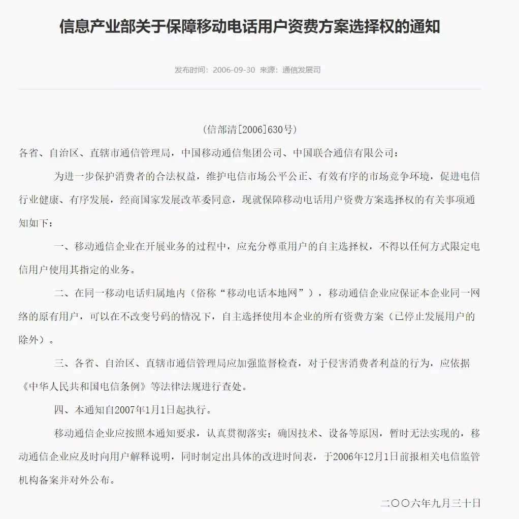 而且工信部早在 2006 年就出台过通知:用户有权自主选择所有资费方案。