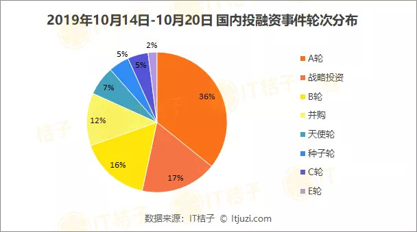 从轮次分布来看,上周 A 轮事件占比较大,发生 53 起,占比 36%;战略投资排名第二,发生 26 起,占比 17%;B轮融资事件位列第三,发生 24 起,占比约 16%。