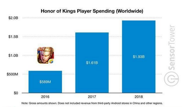 根据Sensor Tower商店的数据统计,仅2018年,《王者荣耀》这一款游戏的收入就达到了19.3亿美元,这还只是其一年的全球总收入,要知道有多少游戏从上线到下架都达不到如此多的收入,而这个收入还不包括国内的安卓系统充值的收入,仅仅只是IOS玩家的充值数目,如果加上通过安卓系统或者是其他充值方式的话,这个数值可能还会翻上数番。
