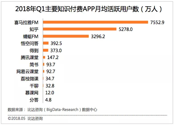 据比达咨询发布的《2018年第1季度中国知识付费行业市场研究报告》显示:2018年第1季度主要知识付费APP月均活跃用户数方面,喜马拉雅FM月均活跃用户数位列第一,为7552.9万人,用户流量优势显著。知乎排名第二,为5278.0万人。蜻蜓FM以3296.2万人月均活跃用户数排在第三位。其余企业月均活跃用户数未上千万级。得到虽然排名第五,但是与喜马拉雅的月活用户差了20倍不止。
