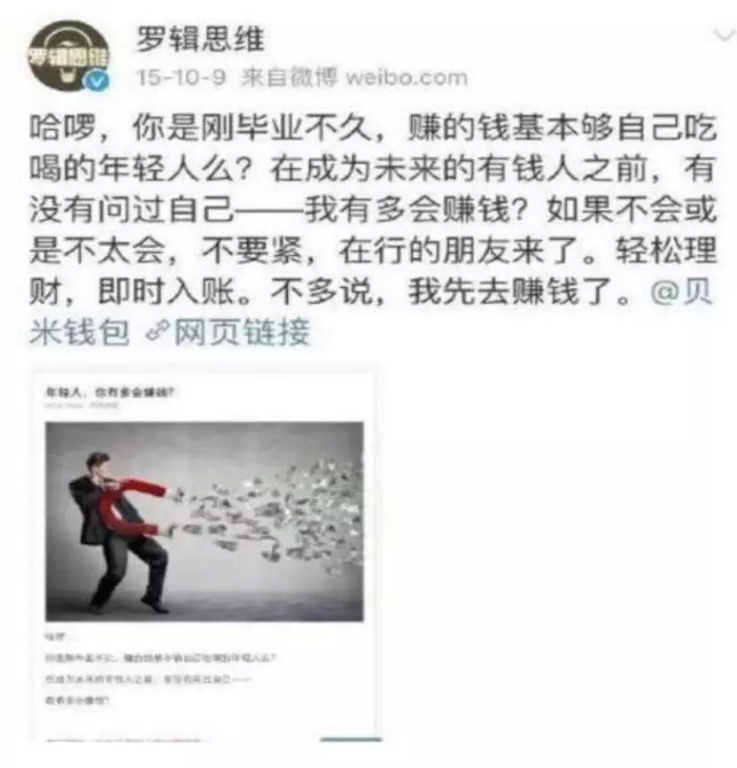 2018年,罗振宇站台的贝米钱包爆雷,导致5.4万人血本无归,这其中也有不少罗振宇的粉丝。因为早在2015年的一期常规节目中,罗振宇和罗辑思维官方微博就亲自为其背书,并且表示自己已经投入了不少资金。巧合的是,除了罗振宇之外,吴晓波也参与了这场P2P的闹剧。贝米钱包爆雷之后,罗振宇方面从此对其闭口不提,并且悄悄删除了为其背书的广告。