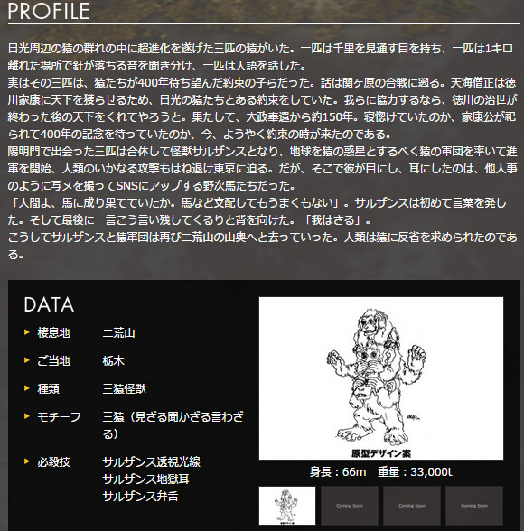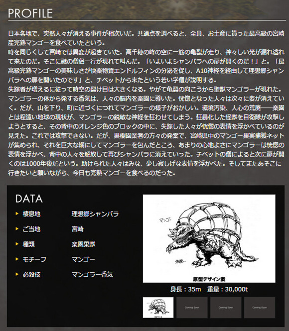 为了让怪兽的代言显得更有说服力,他们甚至给每只怪兽都设定了一个故事。比如关于这只芒果拉的来历,就有一个史诗般的传说: