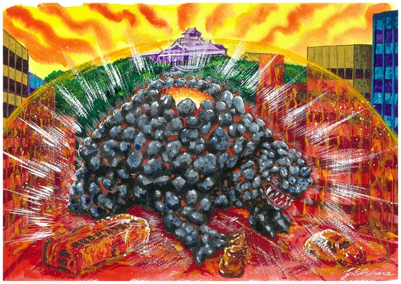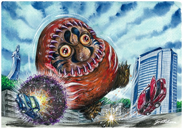 如此一来,普通市民自然是买不到达磨了。议员们当场打起了口水仗,唾沫横飞乌烟瘴气。大约是为了净化空气,一只巨大的达磨怪出现在高崎市上空,骨碌骨碌地打着转。