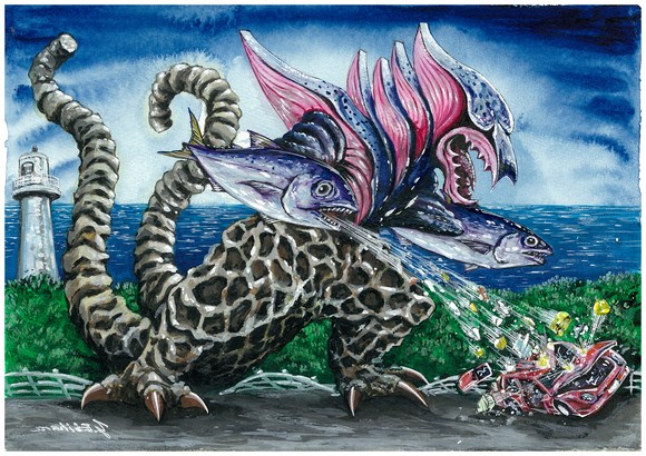 话说这天,一对小情侣开车从足摺岬开过,顺手把垃圾往窗外一扔,海底发出了一阵亮光。男子觉得有趣,把公园里的垃圾箱囫囵投进海里,只听轰隆隆一声巨响,鲭鱼拉从海底升起,原来那亮光竟是鲭鱼拉两眼发出的怒火。