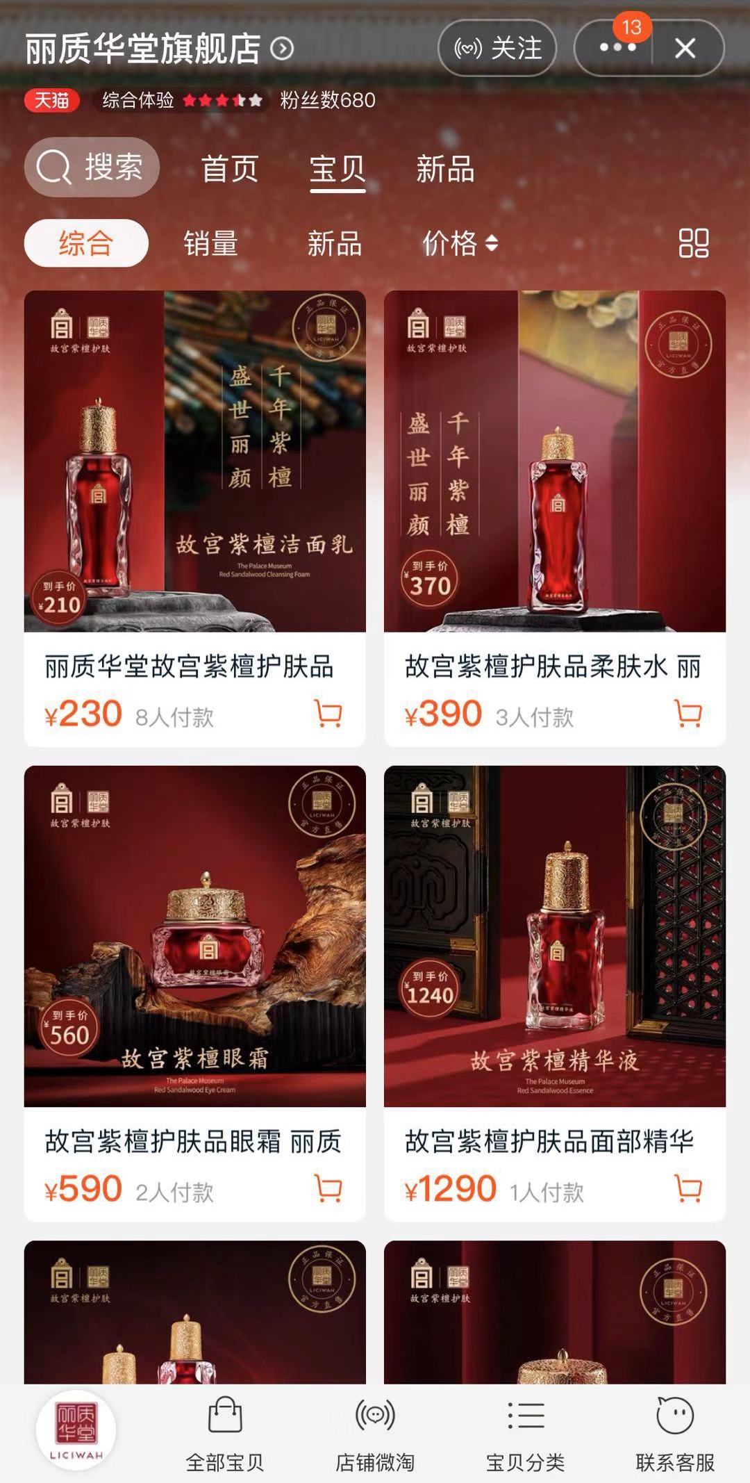 “故宫紫檀护肤品”于17日陆续在丽质华堂天猫旗舰店、丽质华堂京东自营旗舰店、故宫博物院文化创意馆、故宫博物院文创天猫旗舰店、故宫博物院文创京东旗舰店、故宫博物院线下店、故宫博物院微店等多个平台发售,但界面新闻记者查询发现,截止10月21日,丽质华堂旗舰店内售价230元的“洁面乳”仅8人付款,390元的柔肤水3人付款,590元的眼霜2人付款,1290的面部精华1人付款,990元的面霜2人付款,890元的睡眠面膜0人付款。