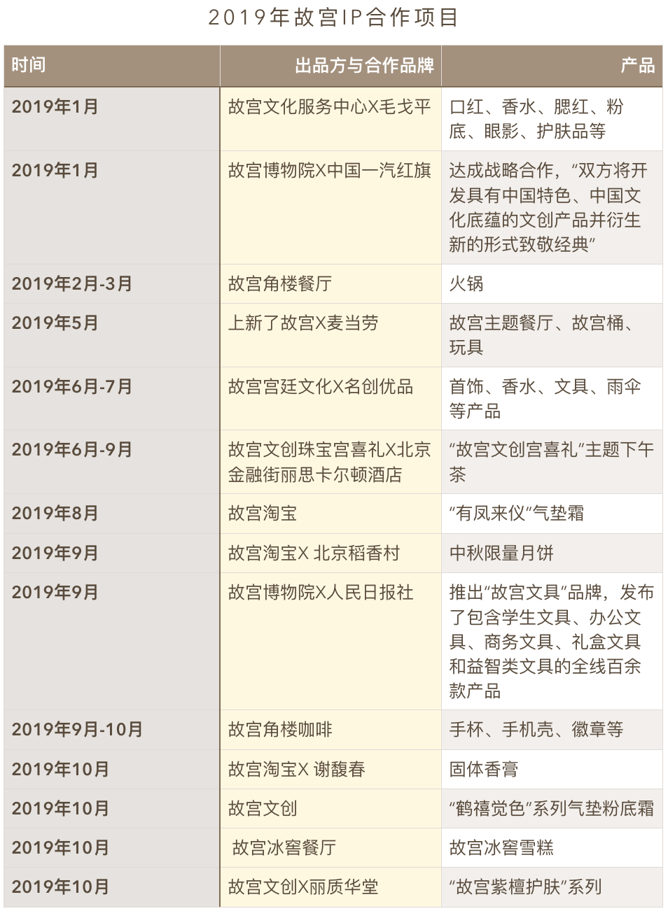 根据故宫博物院官网和媒体公开报道,我们对2019年至今,故宫各文创部门与不同品牌推出的IP产品及合作进行了不完全统计: