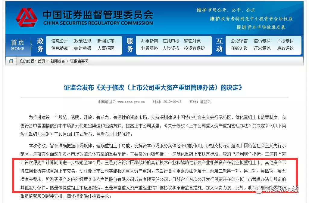 就在10月18日,证监会正式发布《关于修改〈上市公司重大资产重组管理办法〉的决定》(《重组新规》),允许符合国家战略的高新技术产业和战略性新兴产业相关资产在创业板重组上市。