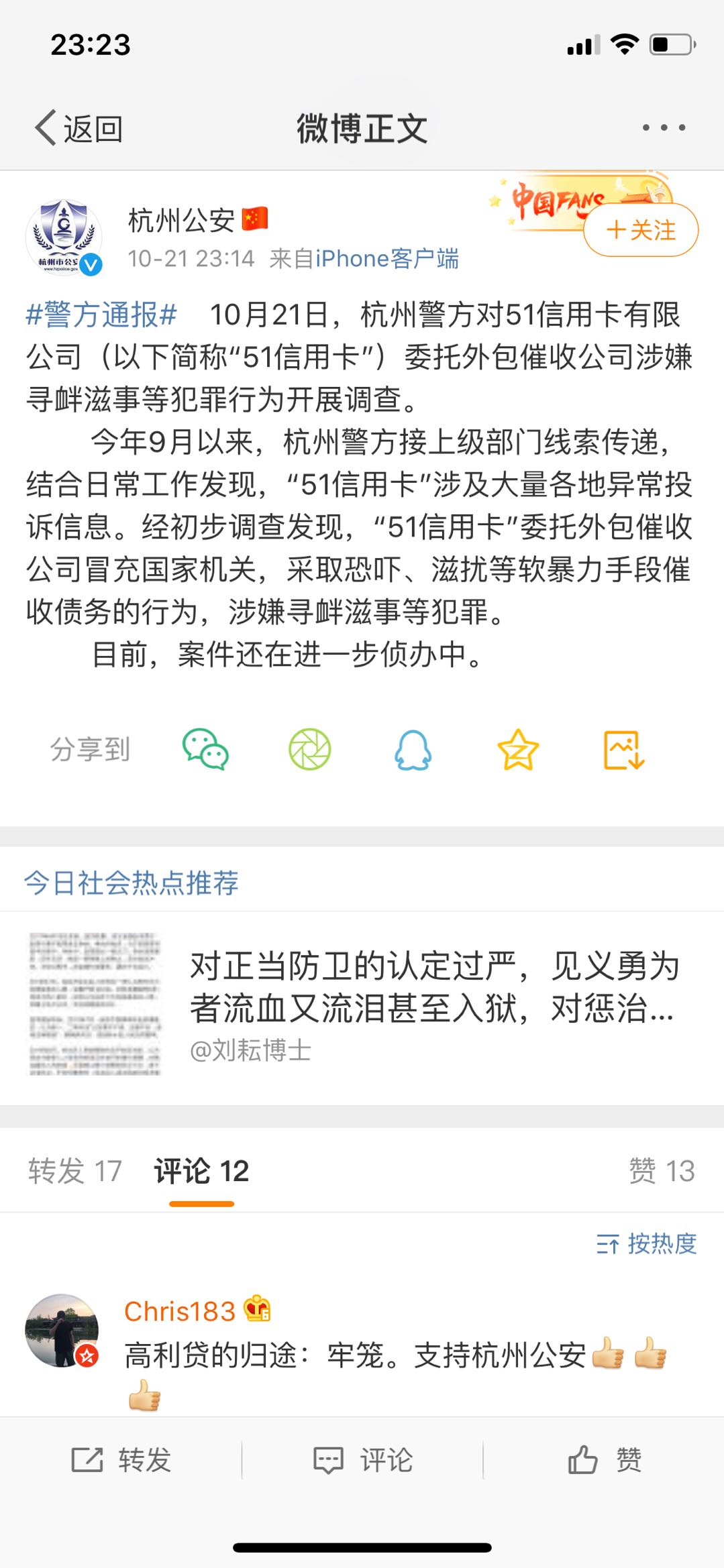 10月21日,杭州警方对51信用卡有限公司委托外包催收公司涉嫌寻衅滋事等犯罪行为开展调查。