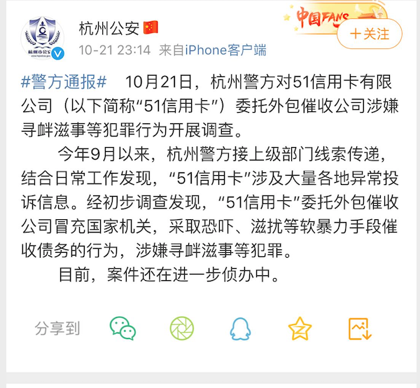 根据通报,今年9月以来,杭州警方接上级部门线索传递,结合日常工作发现,“51信用卡”涉及大量各地异常投诉信息。经初步调查发现,“51信用卡”委托外包催收公司冒充国家机关,采取恐吓、滋扰等软暴力手段催收债务的行为,涉嫌寻衅滋事等犯罪。目前,案件还在进一步侦办中。
