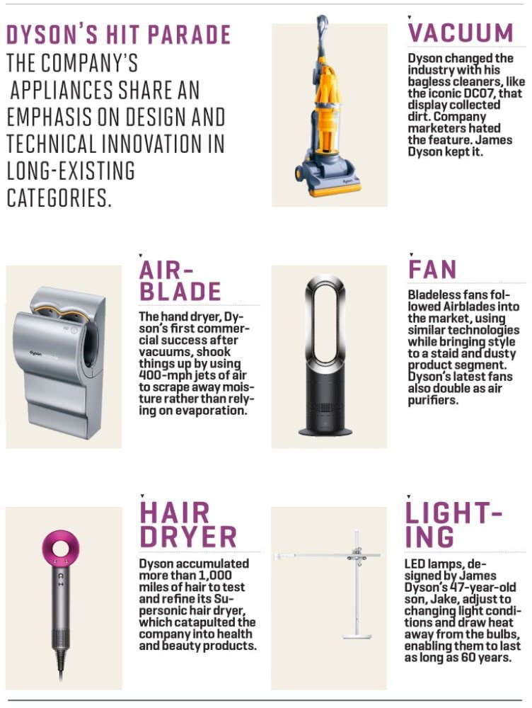 新的真空吸尘器型号包括更多先进的技术,如球状手柄附件,让吸尘器可以进入不容易清扫的角落。细长的无绳直立装置也是由该公司的电动机研究团队帮助实现的。戴森还擅长将他的专业知识扩展到新的类别,如AirBlade干手机以及无叶风扇、空气净化器等。