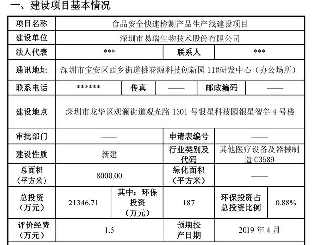 据易瑞生物环境影响报告表,"根据现场勘察,项目所在建筑目前处于施工阶段,项目处于设备采购阶段,待建筑竣工并通过验收后、项目通过环保审批后正式投产,现申请办理环保审批手续。"还提到,该项目的预期投产日期为2019年4月。