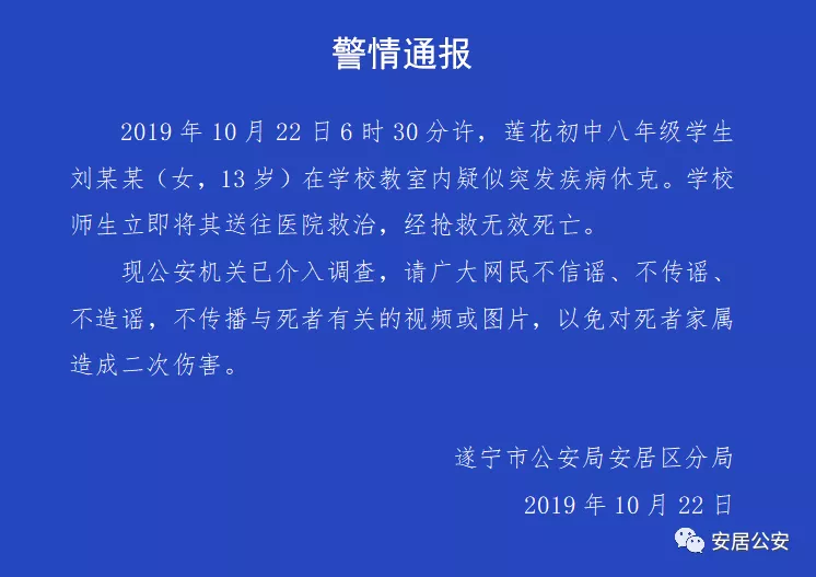 遂宁市公安局安居区分局通报,2019年10月22日6时30分许,莲花初中八年级学生刘某某(女,13岁)在学校教室内疑似突发疾病休克。学校师生立即将其送往医院救治,经抢救无效死亡。