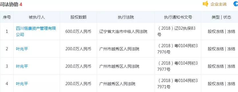 其中,叶兆平、四川恒康所持股份已被司法冻结。二者均被冻结持有股权及其它投资权益600万元,合计1200万元。