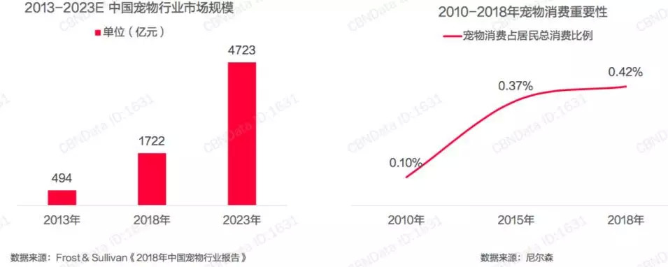近些年,随着我国人民物质水平的提升,越来越多的年轻人开始饲养宠物。根据Frost&Sullivan和尼尔森的报告,我国2013-2018年宠物行业市场规模增长了近3.5倍,并且将延续爆炸式增长趋势,在2023年达到接近5000亿的规模;宠物消费的重要性也比十年前提升了四倍多。