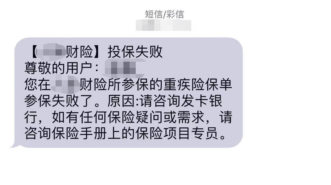 不仅是吴女士,另一位广发银行钻石卡卡主王先生也是遇到了参保失败的情况。其表示,前一天申请投保重疾险,后一天就立马收到了保险公司发来的参保失败的短信。