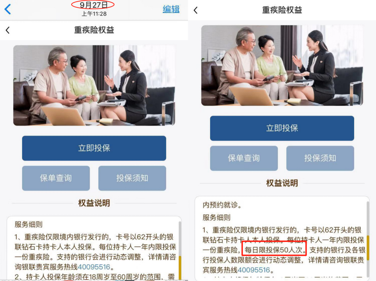 得到该答复后,吴女士再次打开云闪付App发现,与当初申请时的页面相比,银联卡权益中的“重疾险权益”页面竟经过了修改,新增“每日限投保50人次”这条规定。值得注意的是,吴女士与王先生均是在页面修改前申请的投保。