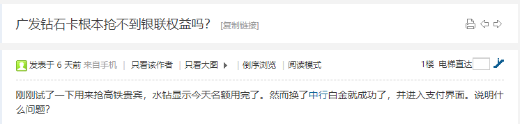 蓝鲸财经查阅某信用卡论坛发现,也有消费者就广发钻石卡的问题表示,用广发钻石卡抢不到银联的权益,但换成别行的卡即可。