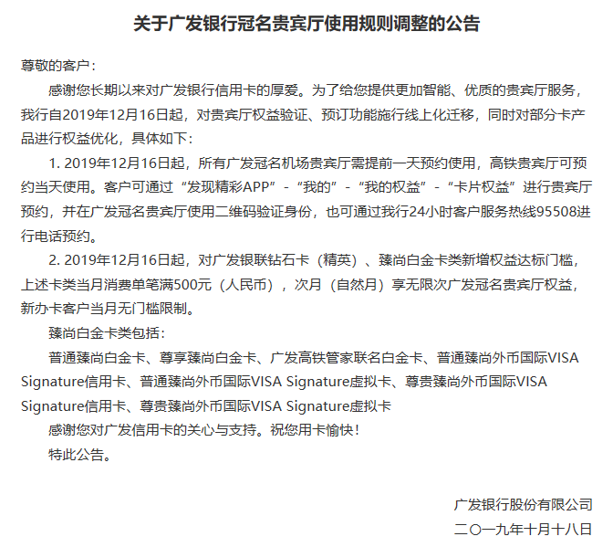 除此之外,广发钻石卡在广发自身提供的权益方面,似乎也有“缩水”迹象。10月18日,广发信用卡官网下发通知称广发银行冠名贵宾厅权益增加了达标门槛,要求单笔满足一定的金额才可下个月预约,而银行方面并未提醒持卡人。该通知显示,“2019年12月16日起,对广发银联钻石卡(精英)、臻尚白金卡类新增权益达标门槛,上述卡类当月消费单笔满500元(人民币),次月(自然月)享无限次广发冠名贵宾厅权益,新办卡客户当月无门槛限制。”