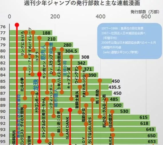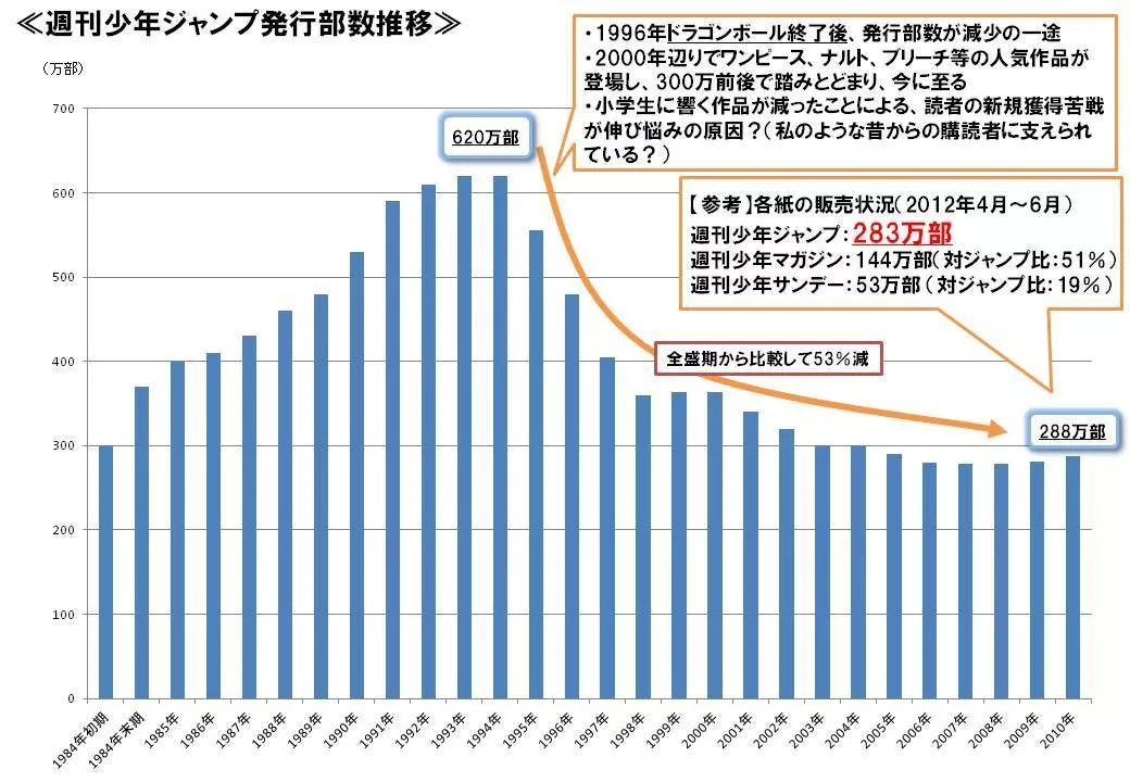 受到《龙珠》故事收官和《灌篮高手》剧情进入白热化影响,《jump》1995年的发售量达到了史无前例的653万本。可到了第二年,《龙珠》完结的影响就开始显现,《jump》的发售量直接锐减了70万本。而雪上加霜的是,1996年《灌篮高手》等热门漫画也先后完结,因此等到1997年时,《jump》的发售量就只有405万、两年间减少了250万,直接回到了80年代初期的水平。