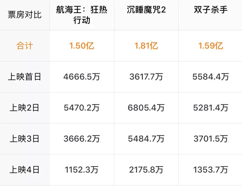 尽管上周五同时有李安的新作《双子杀手》和迪士尼热门续作《沉睡魔咒2》上映,但日本动画电影《海贼王:狂热行动》(内地译名为“航海王”)还是在周末三天里成功斩获1.39亿元票房,单日票房一度逆袭《双子杀手》,首周的票房成绩和《双子杀手》(1.49亿元)与《沉睡魔咒2》(1.60亿元)算是旗鼓相当。