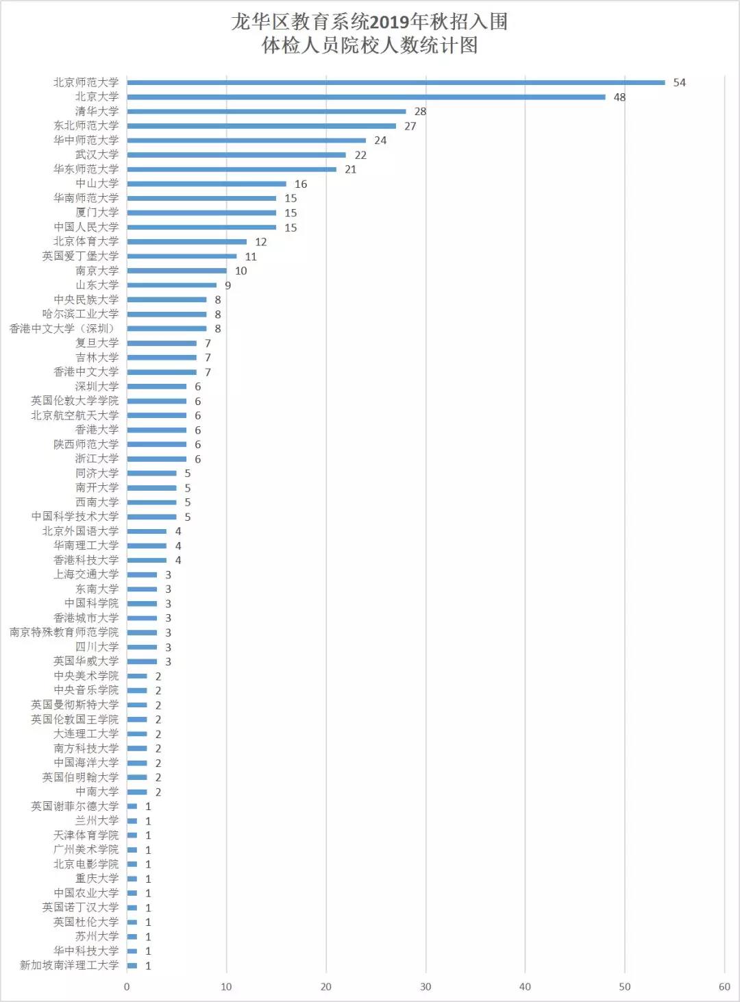 深圳市龙华区教育局公布,来自全球62所院校的491名毕业生入围体检,成为“准龙华教育人”。入围体检的491名毕业生中,89%的毕业生来自A类双一流院校、部属师范、世界排名前100高校,录取人数前3的院校为北京师范大学、北京大学、清华大学。研究生及以上学历共计423人,占比86.2%,其中包括多名来自北京大学、清华大学的博士。