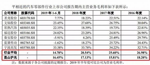 根据申报稿,A股市场尚不存在主营业务为汽车线束的上市公司。而对比零部件行业中收入规模相近的上市公司,2016至2018年,公司毛利率在整体随市下滑的同时,持续低于行业平均水平。