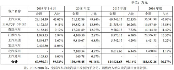 报告期内,公司前五大客户的销售收入合计占当期主营业务收入的比例分别为95.08%、88.86%、87.65%及81.31%,其中对第一大客户上汽大众的销售占比为43.02%-52.13%;公司存在客户集中度较高的风险。