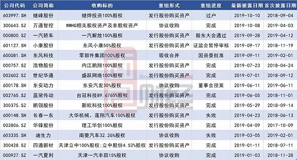 2019年初至今,汽车零部件行业新增4家企业披露并购重组预案;截止2019年10月21日,汽车及配件行业年内完成并购重组的企业有8家,重组失败的企业有2家,另有5家企业的并购重组仍在进展中。具体情况如下:
