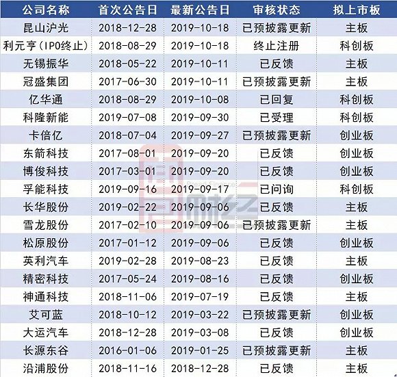 从公开信披数据来看,目前计划IPO的汽车零部件企业不只昆山沪光一家。除主动撤回注册申请的利元亨外,截止2019年10月21日,排队的IPO的汽车零部件及相关企业共有18家;另有1家商用整车企业(大运汽车)排队IPO,具体情况如下: