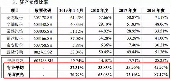 根据申报稿,截止2019年6月,昆山沪光的资产负债率约70.79%,较大幅度高于行业平均水平。