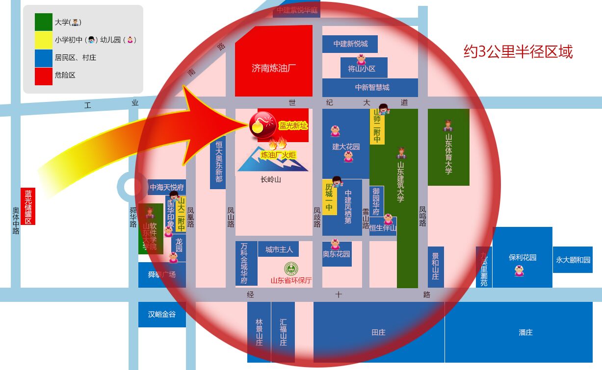今年年初,来自山东建筑大学的济南市政协委员鲁敏曾在市政协十三届三次会议上提出另择他址的建议。济南市规划局则认为该项目并无违规之处,并回复鲁敏说:“依据《城镇燃气设计规范》、《石油化工企业设计防火规范》等相关规范,液化石油气供应基地与炼化企业放散火炬,居住区、村镇、学校、影剧院、体育馆等人员集中地区,110KV高压线,城市道路,炼化企业等防火间距中最大值为120米,液化石油气供应基地的全压力式贮罐与基地外建、构筑物的最大防火间距为不小于200米。该选址东侧、西侧及南侧规划为郊野绿地(东侧用地作为安全防护绿地征用),北侧世纪大道以北规划为二类工业用地,周边规划控制防护距离最小值为200米,该处选址既可满足最大防火间距要求,又能为拆除炼油厂至草山岭储存基地的液化石油气输送管线,减少城市安全隐患,便于石化企业集中管理,减少运行隐患提供条件。”
