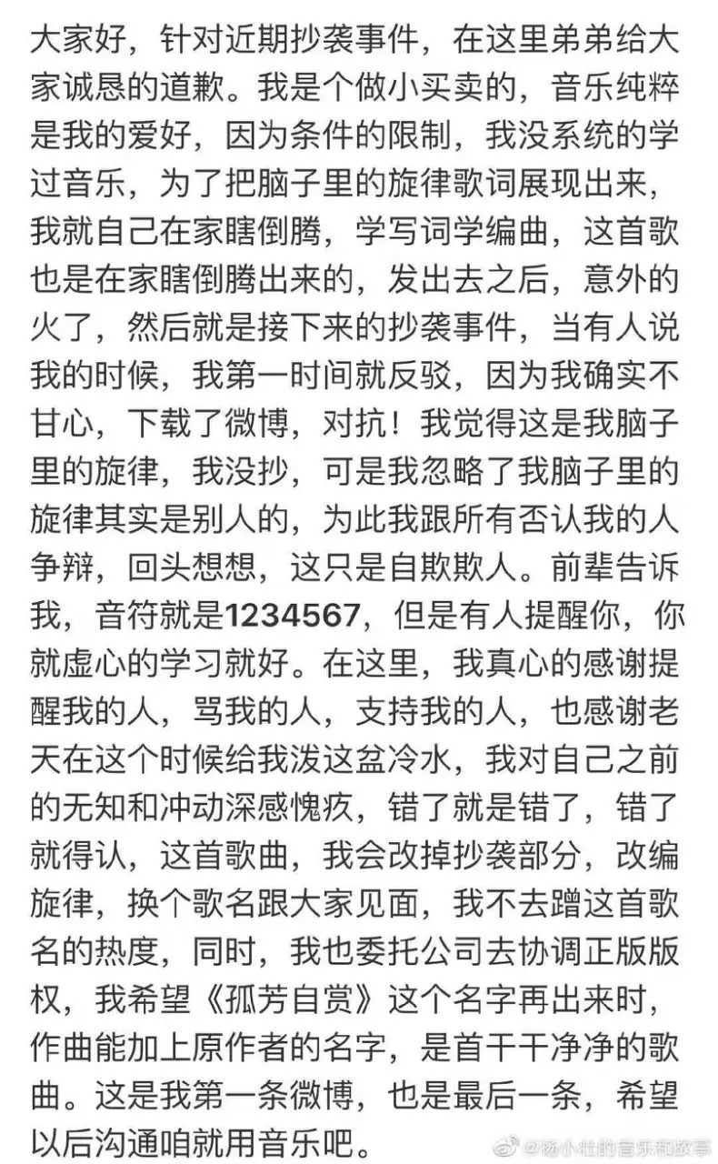 10月8日,在歌曲被下架的三天后,杨小壮的发布了一条微博: