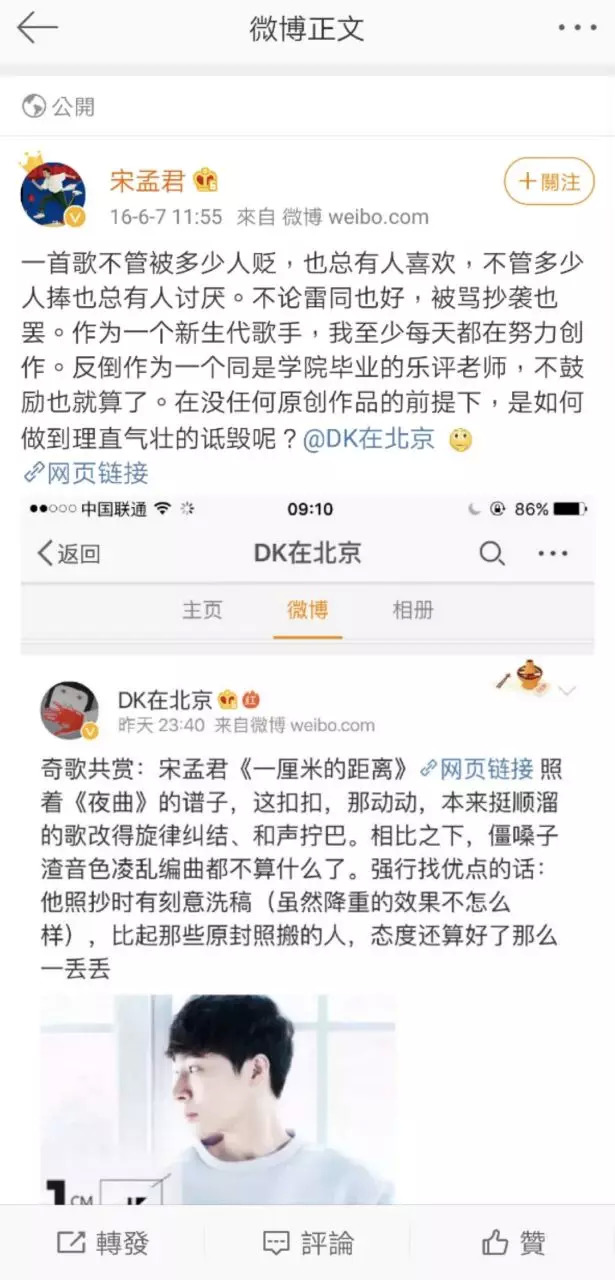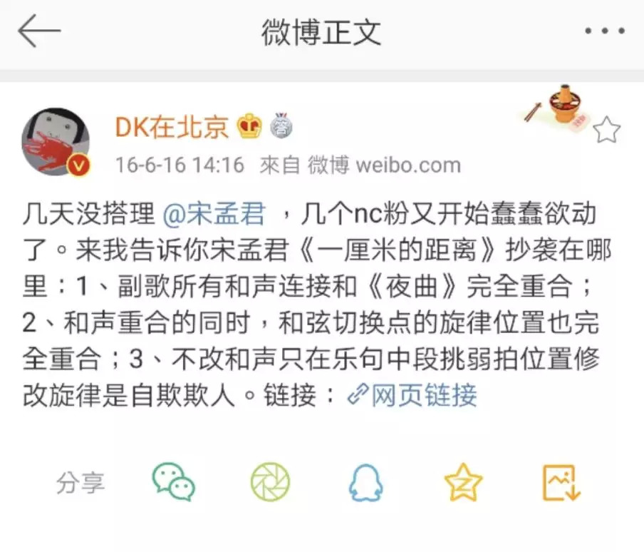 针对邓柯的言论,宋孟君先是以喜好不同来偷换抄袭的质疑,然后以“没有任何原创作品”来质疑邓柯的质疑资格。当然,最后周杰伦所属公司并没有站出来维权,此事也不了了之。可万万没想到的是,《一厘米的距离》仅仅是宋孟君抄袭的一个开端。