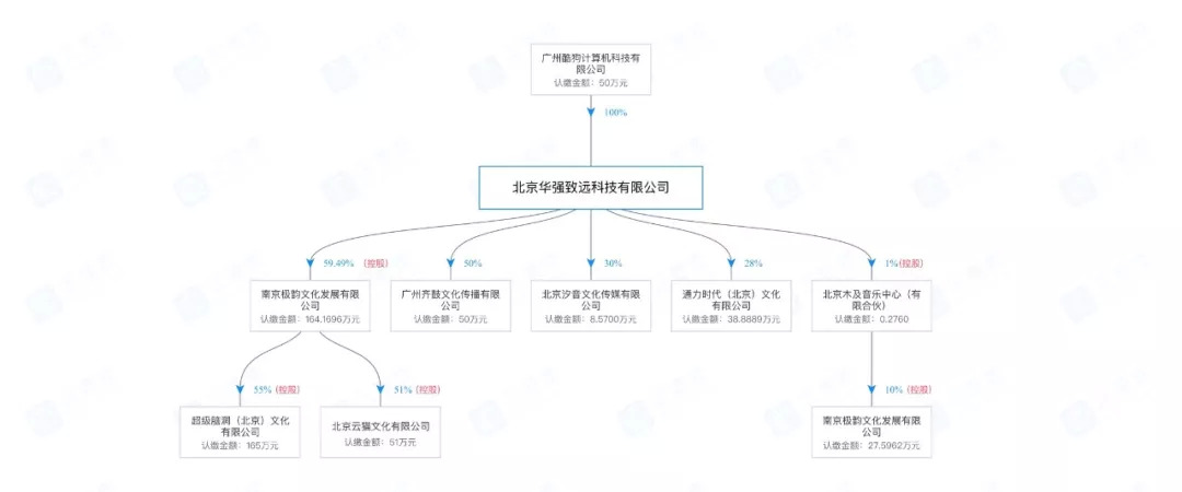 根据企查查的股权透视图显示,极韵文化在云猫文化中占股51%,成为其控股公司,而极韵文化为北京华强致远科技有限公司(占股59.49%)的控股公司。再往后挖会发现,其背后的实际控制方是“广州酷狗计算机科技有限公司”,也就是酷狗音乐。