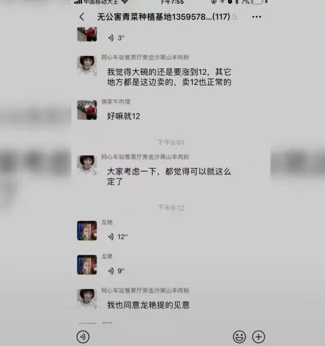 有人提到,贵阳许多地方都涨到了大碗12元,黔西距离贵阳较近,也应该与贵阳保持一致。高连红表示赞同,“我觉得的大碗还是要涨到12,其他地方都是这么卖的……”她在群里回复。