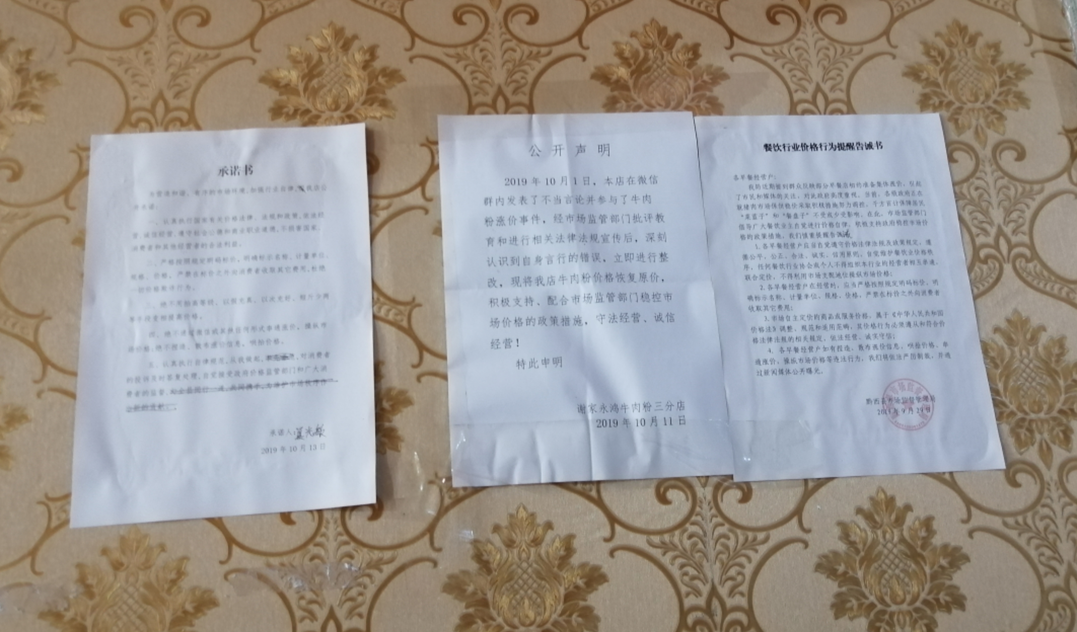 当天,执法人员向他们告知了处置决定,并要求他们将一份“公开声明”张贴在店里,并分享到微信朋友圈。声明中,他们承认自己在微信群发表“不当言论”,经“批评教育和相关法律法规宣传”,“深刻认识到错误”,并表示对牛羊肉粉“维持原价”,“积极支持配合市场监管部门的价格政策措施。”