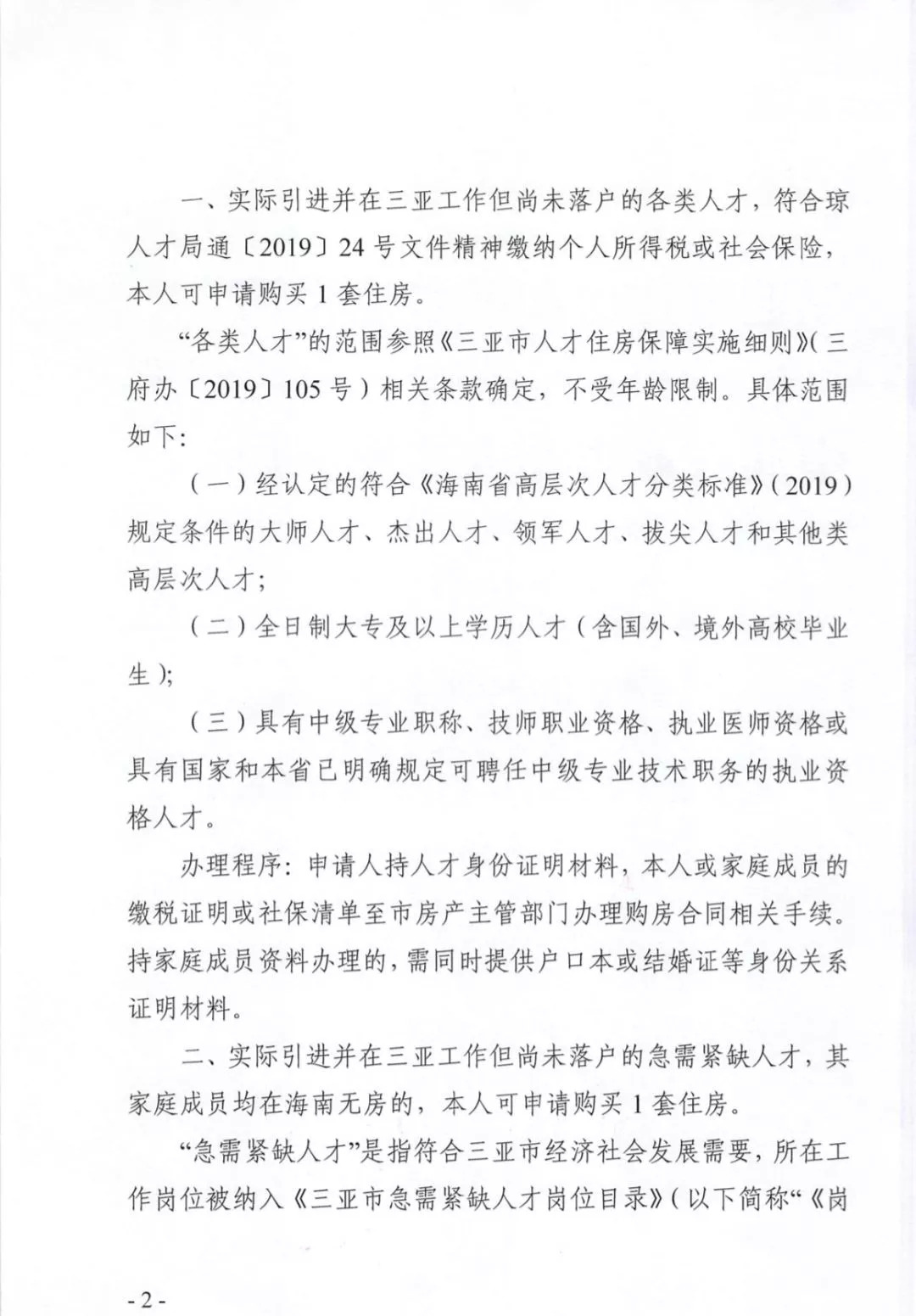 通知指出:实际引进并在三亚工作但尚未落户的各类人才,符合琼人才局通〔2019〕24号文件精神缴纳个人所得税或社会保险,本人可申请购买1套住房。而实际引进并在三亚工作但尚未落户的急需紧缺人才,其家庭成员均在海南无房的,本人可申请购买1套住房。此外,柔性引进的各类高层次人才,聘期在3年以上且已在海南服务1年以上的,经认定,在购房方面可享受本地居民同等待遇。