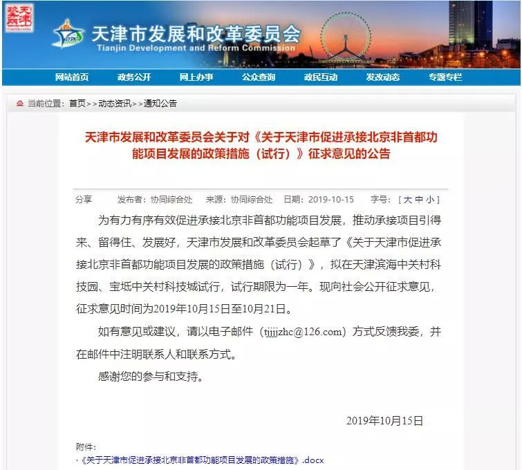 10月15日,天津市发展和改革委员会发布关于对《关于天津市促进承接北京非首都功能项目发展的政策措施(试行)》征求意见的公告。